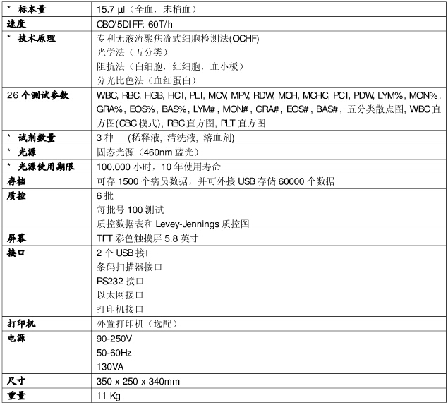 檢測原理:四角度激光散射技術測定WBC、5DIFF經典電阻抗法測定WBC、RBC、PLT環保型無氰化物法測定HGB