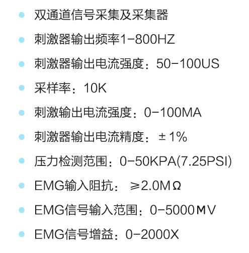 在500Ω負載時,電刺激器脈沖輸出強度電壓峰峰值為0~33V,誤差為±30%,脈沖寬度為0.4ms,誤差±30%。
