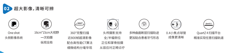 3:頭顱位攝影,采用高速CMOS探測器進行掃描,最快4秒鐘拍攝一張頭顱片,于傳統的通過線性CCD水平掃描拍攝相比,大大縮短了拍攝時間,避免因為長時間的曝光,病人運動而產生的偽影,從而拍攝出優質的頭顱位影像