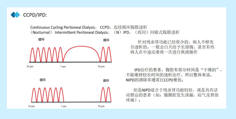 腹膜透析管路安裝到全自動腹膜透析機上,啟動設備,設定治療模式,患者臨睡前將腹膜透析管路與腹腔埋管聯接,睡覺時自動為其做透析治療,治療的 時間可持續8~10個小時。清晨治療完畢后,患者將腹膜透析管路與腹腔埋管分離,就可進行正常的活動。通過全自動腹膜透析機,透析過程可以完全取代人工操作,減輕患者及護理人員的換液、加熱等操作負擔,從而可以提高腹膜透析患者的生活質量,幫助患者重新回歸社會。