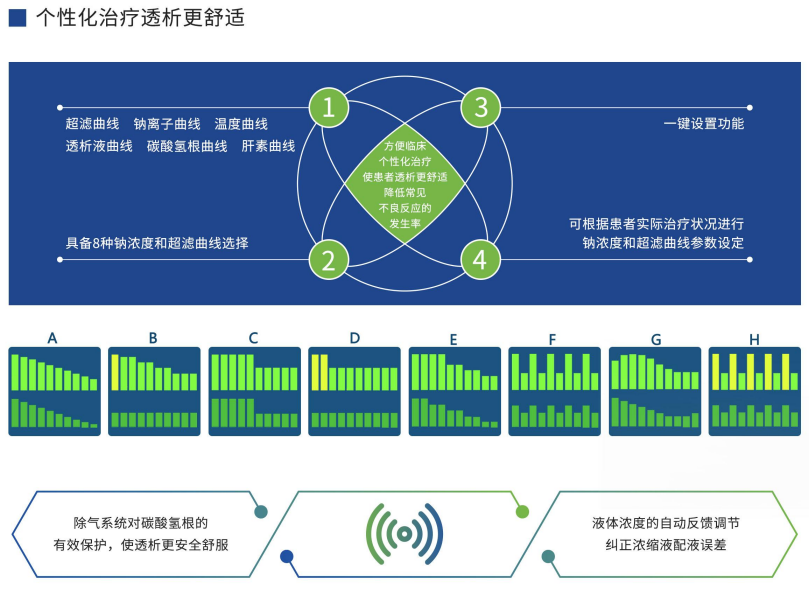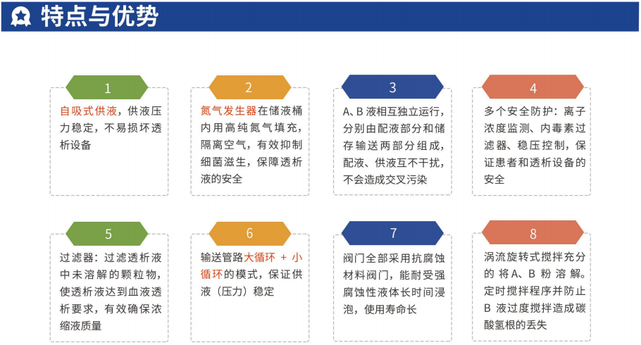 — 溫度超溫提示,自動停止加熱 — 實時監測管路中氣泡,如發現自動排除 — 透析液注入量與排出量不足時,系統提示