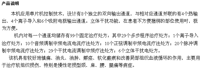 根據現代人體生物電磁理論,結合傳統中醫經絡學、藥物學、現代醫學理論,采用最新的微電腦芯片數字處理技術,并輔以磁場藥物離子導入技術、超聲電導、穴位療技術、遠紅外熱敷法,根據不同的病情在芯片上設置不同的治療輸出信號,通過電磁信號刺激,激發人體組織機能的活力,提高人體新陳代謝、排除病痛,達到快速治療和恢復人體健康的功效。
