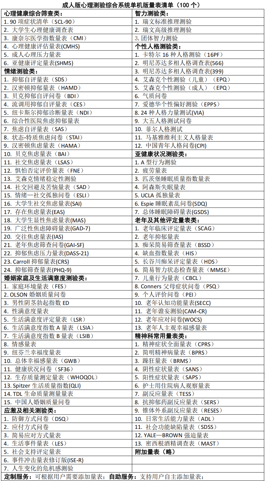 E.量表科研管理系統(tǒng):對測評量表實現(xiàn)完全管理、添加、定義;實現(xiàn)量表類別、名稱、題目、選項、計分、因子、維度解釋、指導建議、預警范圍,被測對象條件控制等全部實現(xiàn)自定義,為進行專業(yè)有效的科研分析提供高效的管理體系。