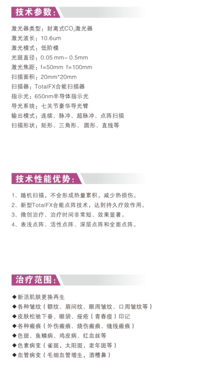2、取教訓超脈沖點陣激光把激光美容提高到一個新水平。醫生可以用其獨特的功能,藝術性的綜合治療,一次治療就能滿足愛美者獨特的體型、輪廓和美容需求。