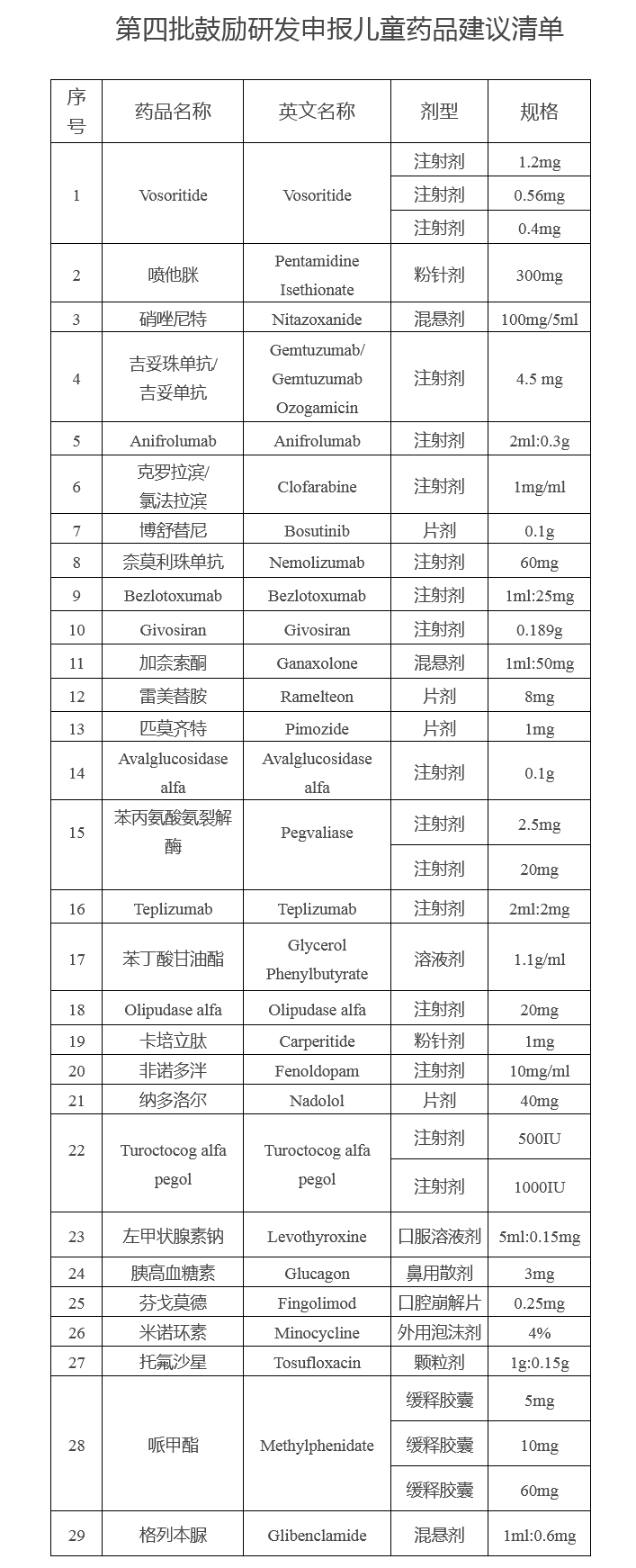 第四批鼓勵(lì)研發(fā)申報(bào)兒童藥品建議清單