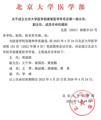近日,北京大學(xué)醫(yī)學(xué)部第103次(2023年第9次)黨政聯(lián)席會(huì)議討論,決定成立北京大學(xué)醫(yī)學(xué)部康復(fù)醫(yī)學(xué)學(xué)系,并任命北醫(yī)三院康復(fù)科周謀望教授為第一屆學(xué)系主任,該科崔國(guó)慶主任為學(xué)系副主任,楊延硯副主任為學(xué)系成員,李濤副主任醫(yī)師為學(xué)系秘書(shū)。