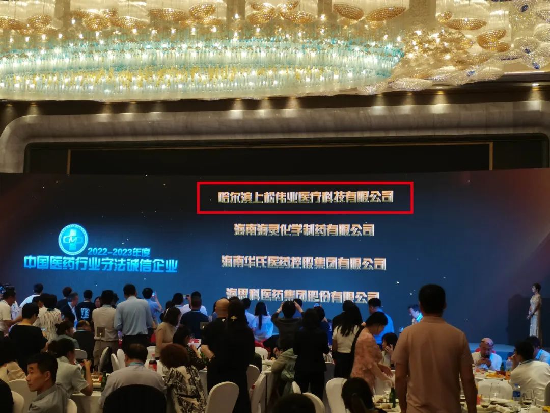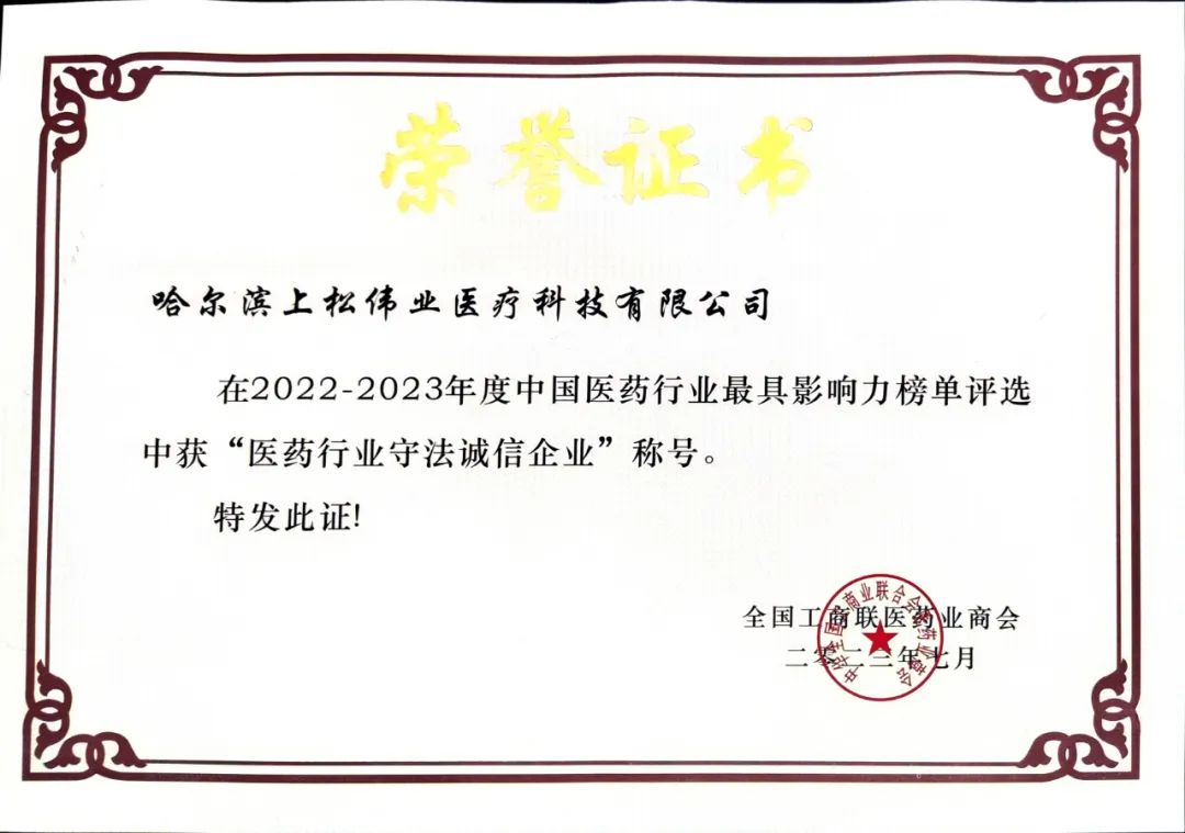 哈爾濱上松偉業醫療科技有限公司再次榮獲“中國醫藥守法誠信企業”稱號。