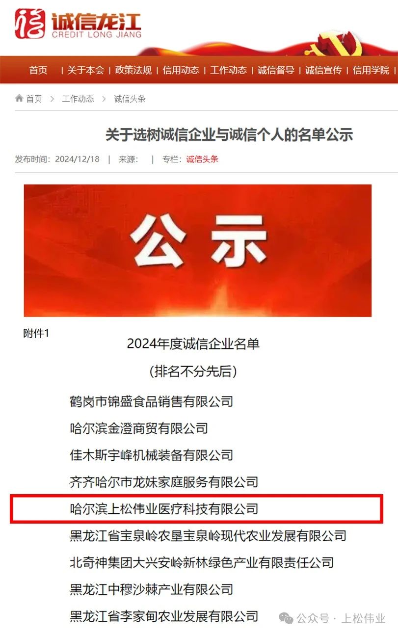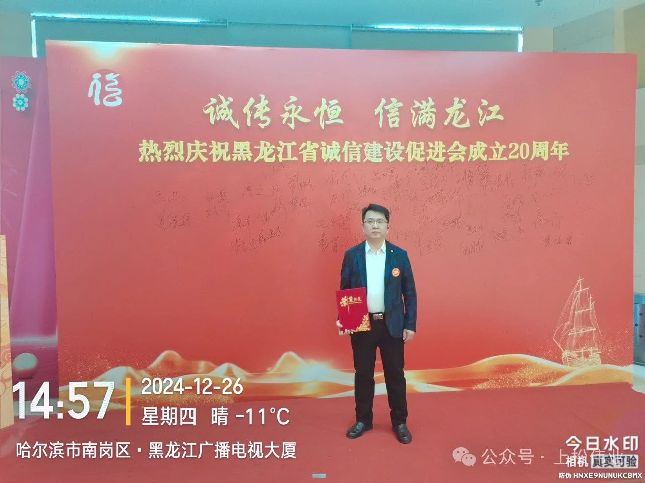 12月26日,黑龍江省誠信建設(shè)促進(jìn)會(huì)成立20周年慶12月26日,黑龍江省誠信建設(shè)促進(jìn)會(huì)成立20周年慶祝大會(huì)在哈爾濱市隆重舉行,并揭曉了黑龍江省2024年度誠信企業(yè)榜單。哈爾濱上松偉業(yè)醫(yī)療科技有限公司憑借誠信工作建設(shè)成果,榮獲“黑龍江省誠信建設(shè)示范企業(yè)”稱號(hào)?。上松偉業(yè)醫(yī)療總經(jīng)理陳國松出席了大會(huì)并上臺(tái)領(lǐng)獎(jiǎng)。