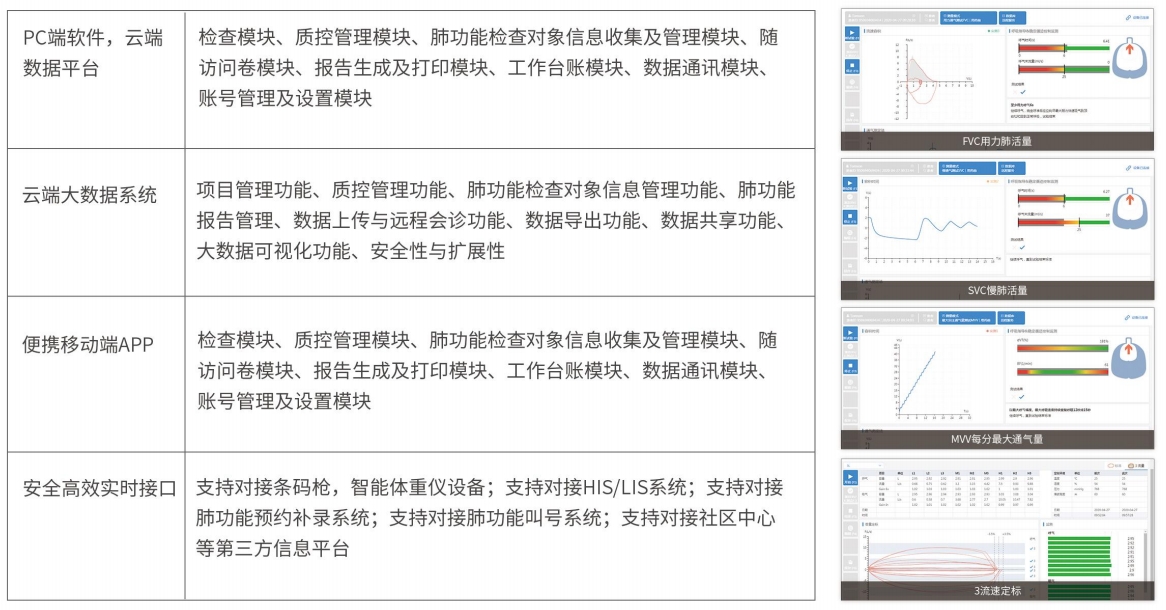 完全滿足"國家基層呼吸疾病早期篩查干預能力"項目的軟件、系統及云端平臺要求;擁有多中心、分布式、動態擴展平臺架構,可支持擴展為省、市、縣、醫院的多中心聯合檢查及分級診療平臺;可接入其它設備數據:如德國耶格大肺數據、呼出氣一氧化氮(FENO)數據、血氣分析儀數據等;可與醫聯體、第三方信息平臺數據對接。