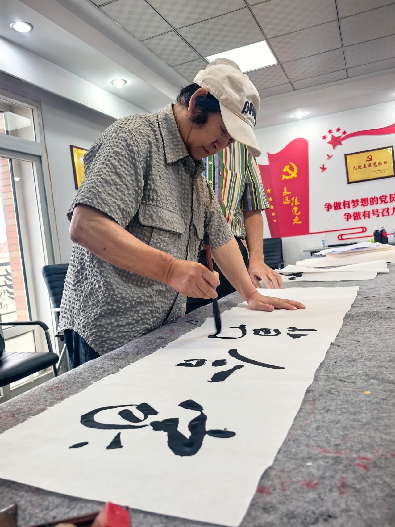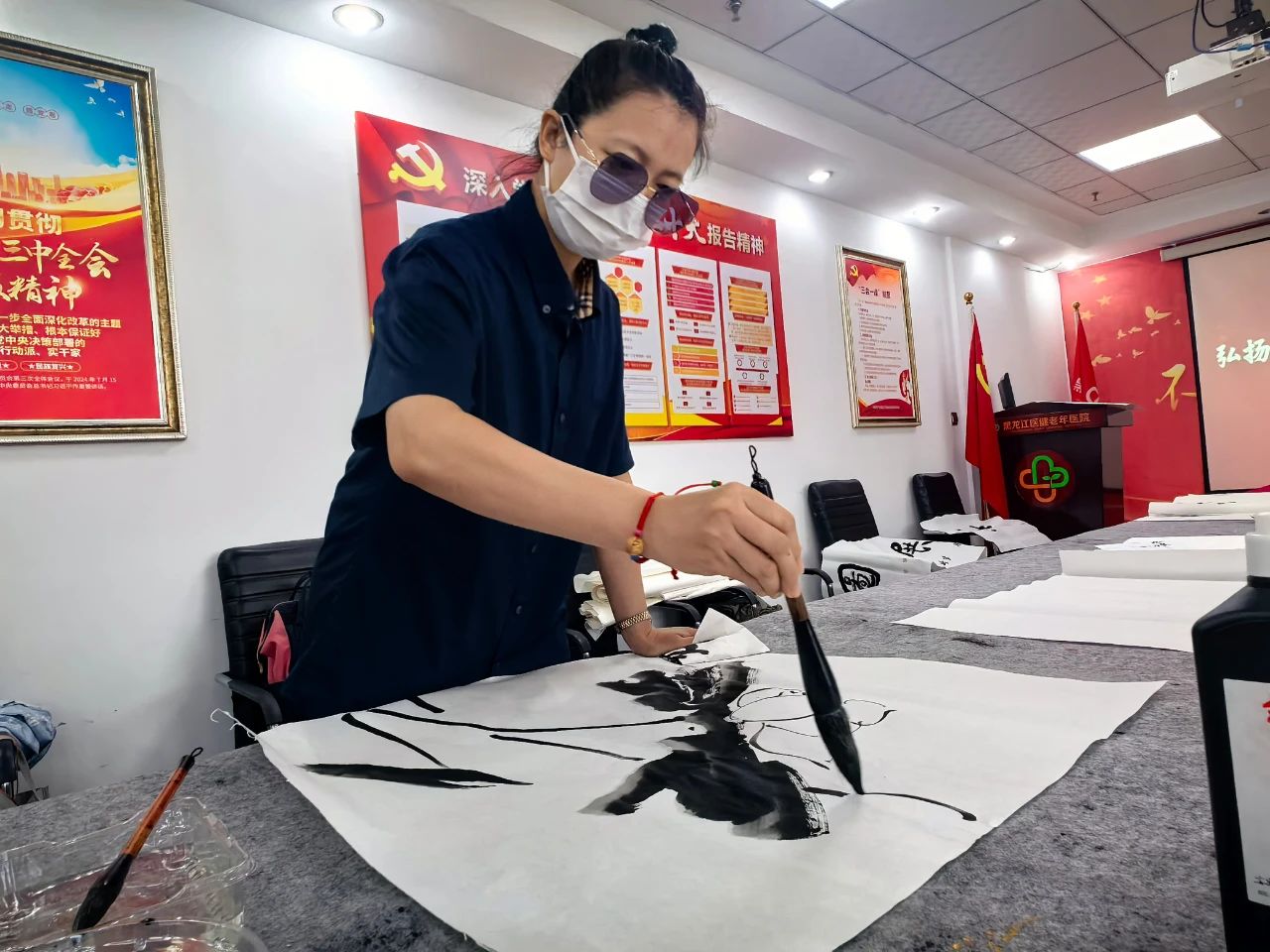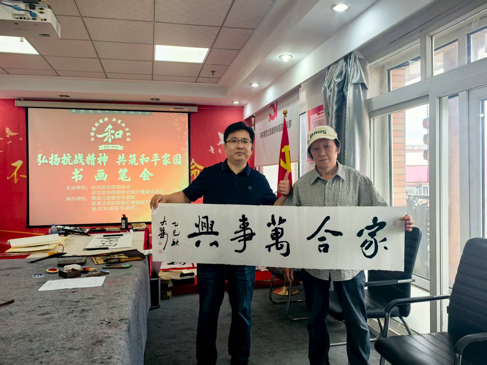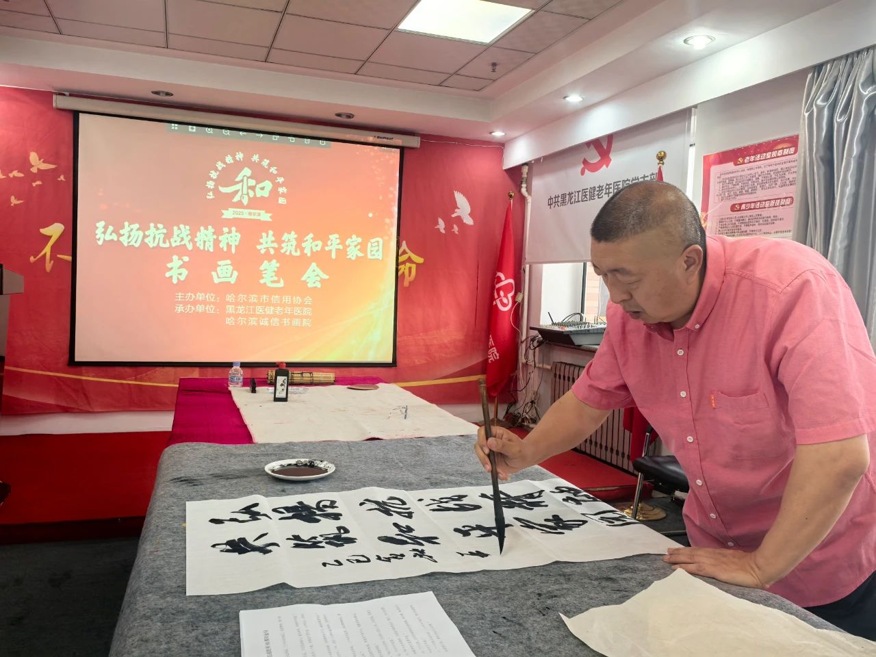 為紀念抗日戰爭暨世界反法西斯戰爭勝利80周年,8月22日,由市信用協會主辦,市信用協會醫療健康委員會、哈爾濱誠信書畫院承辦,紀念抗日戰爭暨世界反法西斯戰爭勝利80周年書畫筆會,在黑龍江醫健老年醫院拉開帷幕。市信用協會會長樊勇、黨支部書記賀青、常務副會長劉鐵華、秘書長王剛、常務理事、醫療健康委員會會長林金海、醫療健康委員會秘書長陳國松等出席書畫筆會。