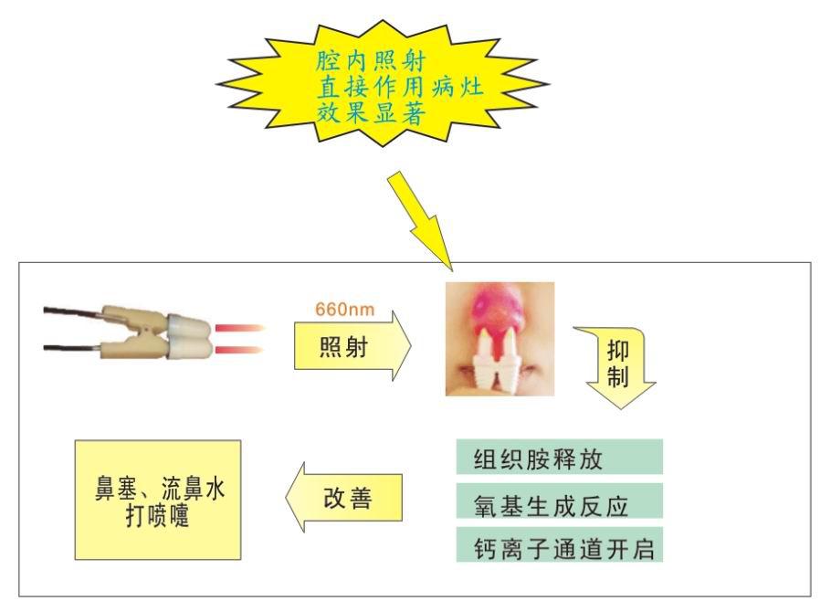 半導(dǎo)體激光部分采用現(xiàn)代生物光醫(yī)學(xué)技術(shù),以波長660nm半導(dǎo)體激光,通過光纖傳導(dǎo),直接照射作用于鼻腔的敏感區(qū),引起血管擴(kuò)張,流血加快,使鼻腔血系中,酶和蛋白分子構(gòu)象發(fā)生改變而產(chǎn)生換能性生物效應(yīng)。通過刺激鼻腔內(nèi)交感神經(jīng)和副交感神經(jīng),增強(qiáng)鼻粘膜血管收縮擴(kuò)張彈性。并在直接殺滅鼻內(nèi)腔表層病菌的同時,剝離血紅細(xì)胞表面包裹層,使細(xì)胞帶負(fù)電荷數(shù)量恢復(fù)正常;相互排斥力加大,把原來聚焦成團(tuán)的紅細(xì)胞分散開。從而促進(jìn)鼻腔血系發(fā)育及攜氧能力,增強(qiáng)鼻腔自身的殺菌免疫及再生機(jī)能,快速修復(fù)受損鼻黏膜,從根本上消除病癥,最終達(dá)到治愈鼻炎的目的。紅光使免疫細(xì)胞受體對花粉等刺激物的反應(yīng)變慢;這種特定光波導(dǎo)致肥大細(xì)胞壁通透性減弱,這就意味著組胺的釋放量減少;免疫細(xì)胞的結(jié)合作用受到局部影響,從而降低了對過敏因子的反應(yīng)。