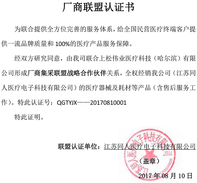 江蘇同人醫(yī)療電子科技有限公司授權(quán)