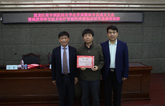 9月23日,黑龍江省中西醫結合學會推拿分會成立大會暨學術研討會在黑龍江中醫藥大學附屬第一醫院召開,副院長劉松江出席會議并致辭,黑龍江省中西醫結合學會秘書長靳萬慶主持會議。黑龍江中醫藥大學附屬第一醫院推拿科主任王軍當選分會首屆會長。黑龍江省名中醫、黑龍江省推拿泰斗王選章教授參會。