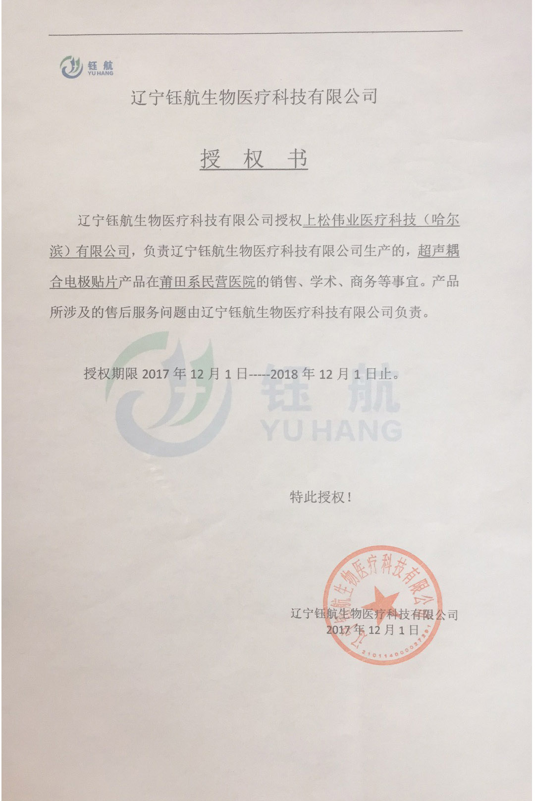 遼寧鈺航生物醫療科技有限公司授權