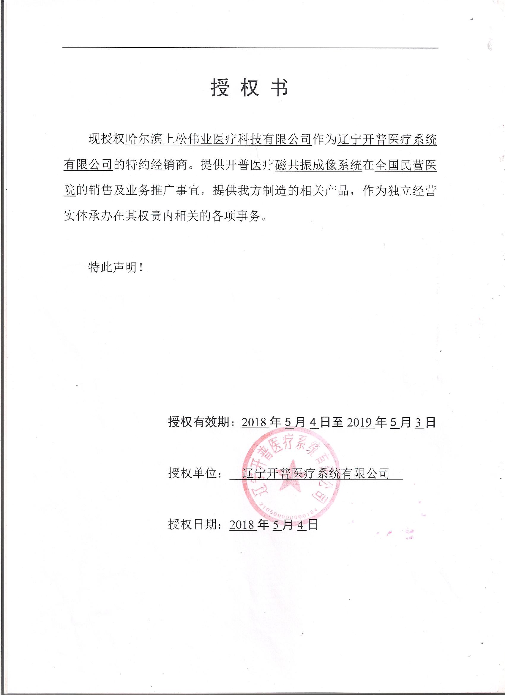 遼寧開普醫療系統有限公司授權書