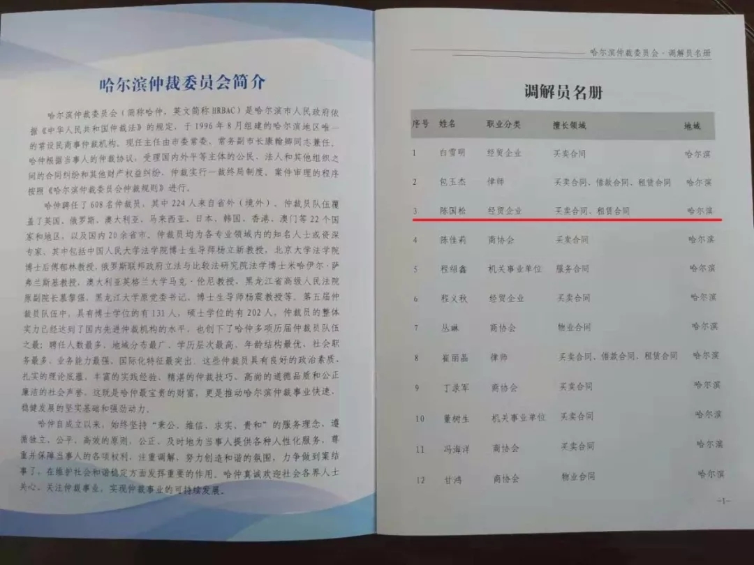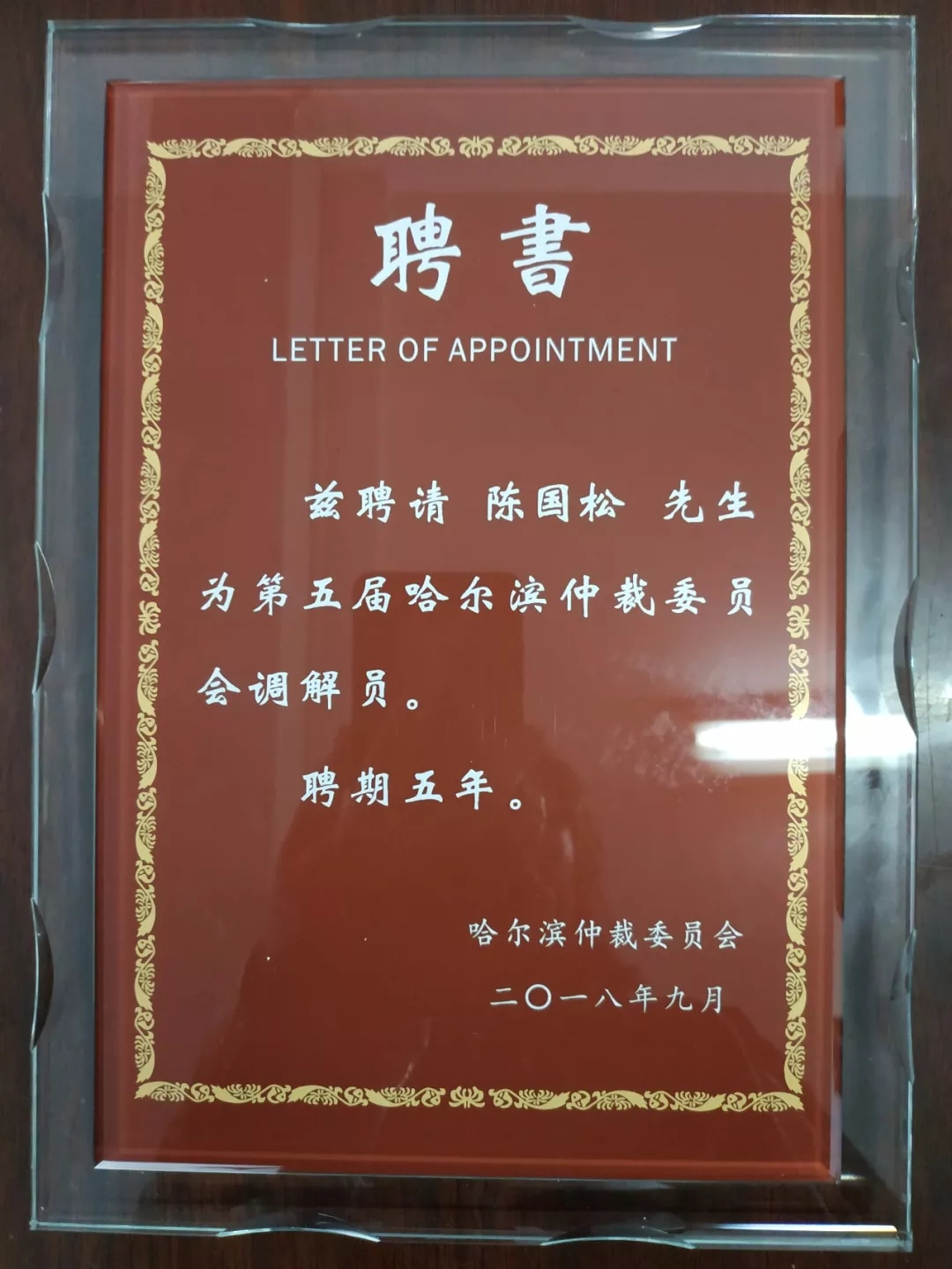 經哈爾濱仲裁委員會研究決定,聘請我董事長陳國松先生獲聘擔任調解員一職。