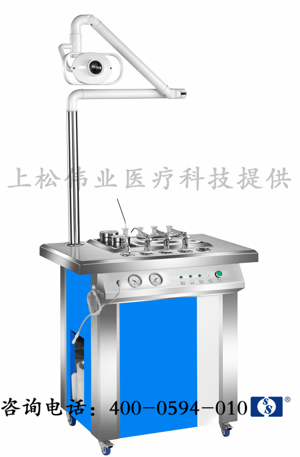 12V/50W,照度≥10000Lux,可在水平180度范圍內旋轉,高低可調,無晃動,便于醫生操作。 |