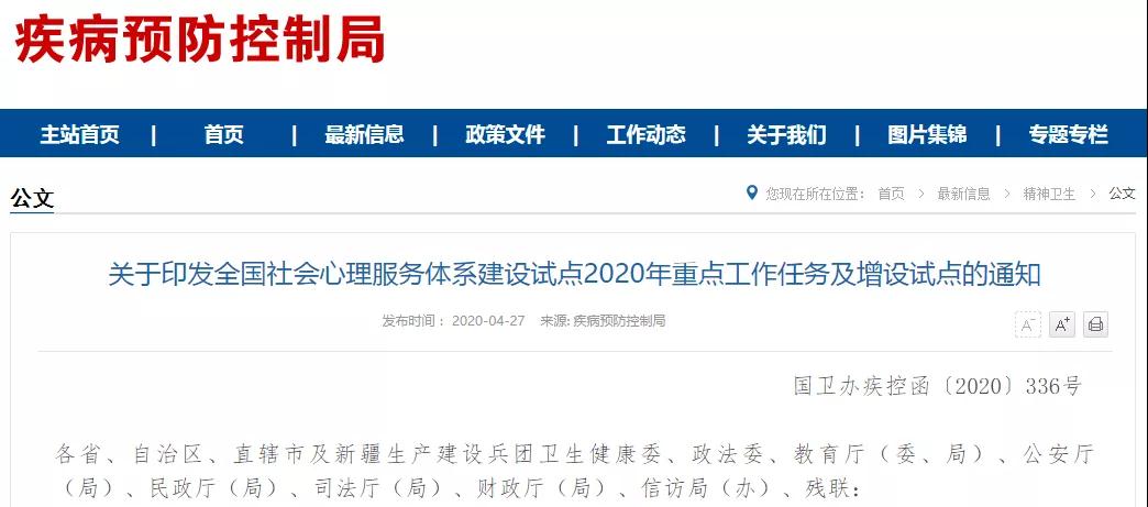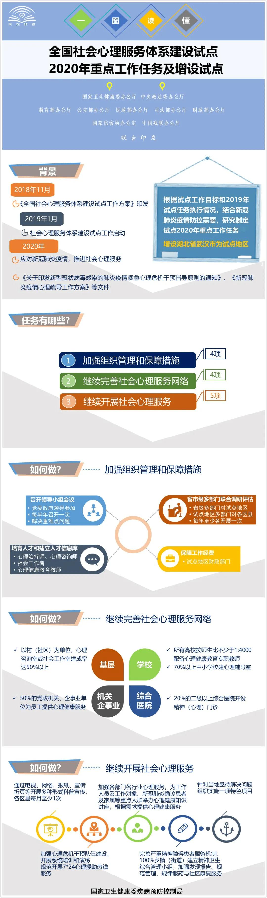 2020年4月26日,國家衛(wèi)生健康委、教育部、中國殘聯(lián)等十部委聯(lián)合印發(fā)《全國社會心理服務(wù)體系建設(shè)試點2020年重點工作任務(wù)及增設(shè)試點的通知》。