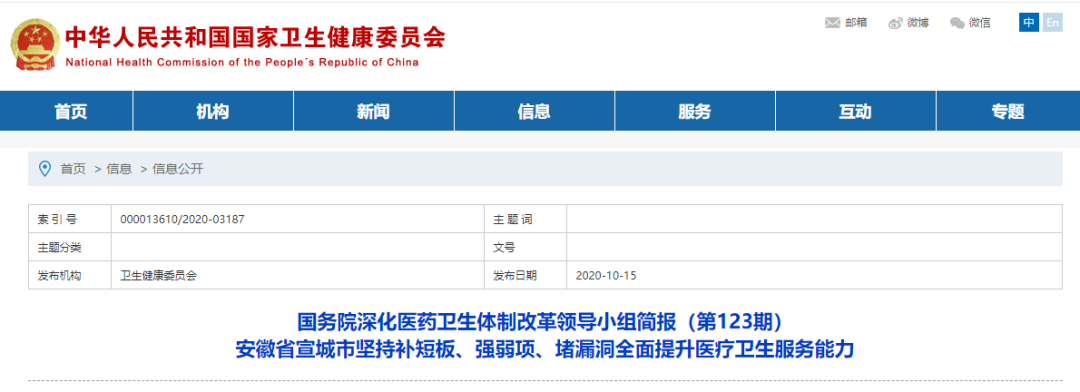 國(guó)家衛(wèi)健委公布《國(guó)務(wù)院深化醫(yī)藥衛(wèi)生體制改革領(lǐng)導(dǎo)小組簡(jiǎn)報(bào)(第123期)》,介紹了安徽省宣城市的基層醫(yī)改經(jīng)驗(yàn)。