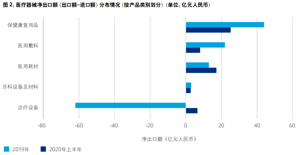 國內醫療器械企業以中小型企業為主,主 要集中于低價值醫用耗材等低附加值器 械領域。這些小型國內企業主導著中低 端市場。就高端器械而言,行業仍高度依 賴于進口,這一細分市場由少數外資品牌 主導。不過,在過去的10年里,國內品牌 在高值醫用耗材細分市場的份額已從約 20%增長至約30%。中國也正在成為全球醫療器械市場日益 重要的參與者。在2015年至2019年期間, 中國醫療器械對外貿易以每年近10%的 速度增長(超過全球增長速度),這使中 國在國際醫療器械貿易市場中所占的比 重越來越大。2019年,中國醫療器械進出 口總額分別達290億美元和270億美元。出口醫療器械以一次性醫用耗材、醫用敷 料和低端醫療設備為主,而進口的醫療 器械近70%為診療設備(大部分為高端產品)。受新冠疫情的影響,2020年是該行業顛 覆性的一年。但是,中國在2020年上半 年的出口總體上有所增長,與去年上半 年相比增長22%。其中,出口增長最 高的類別是醫用耗材(例如口罩),增長43%。同時,總體進口量下降18%, 除了醫用敷料以外的所有產品類別均有 下降。這意味著與以往相比,中國醫療 器械的所有產品類別都為凈出口。因此,中國正日益成為外國企業不容忽視的一大市場。然而,與所有國家的市場一樣,中國醫療器械市場有其獨特的監管和競爭環境,企業需考量如何找準自己在市場中的最佳定位。