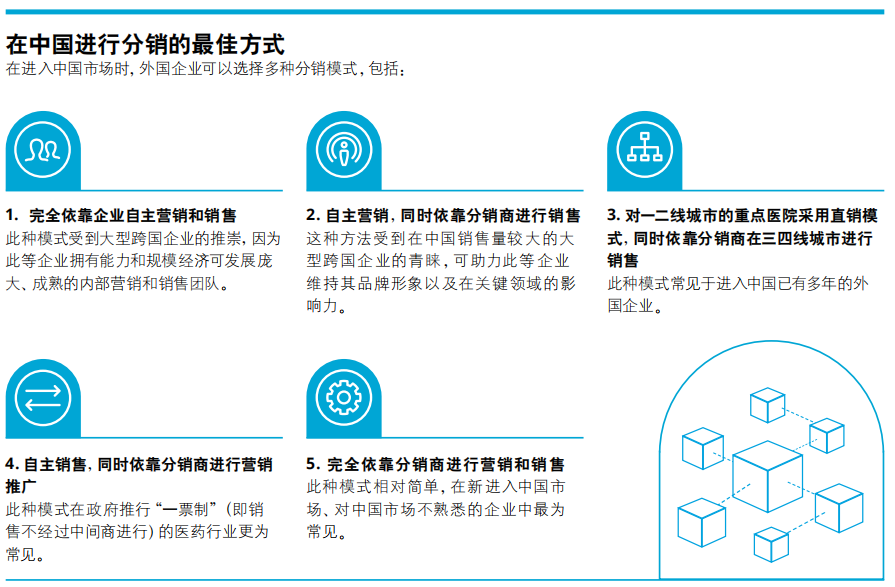 另外,企業可以考慮與本地原始設備制造 商(OEM)合作。通過本地的OEM合作伙 伴,企業可以滿足本地的生產要求,從而減少進入市場所面臨的監管壁壘。與直接投資相比,與本地OEM合作所需的資本投入較少,并有助于更快地進入市場。但是,此種方式會導致面臨更大的IP/技術泄露風險。外國企業亦需努力尋找可以 信賴的合格本地OEM合作伙伴,并持續監控產品質量。因此,這一方式更適合較 為通用的基礎產品或在制造過程中相關IP可得到妥善保護的產品。無論采用哪種市場進入模式,外國企業 都將可能需要依靠分銷商來促進對醫院 和診所的銷售。04