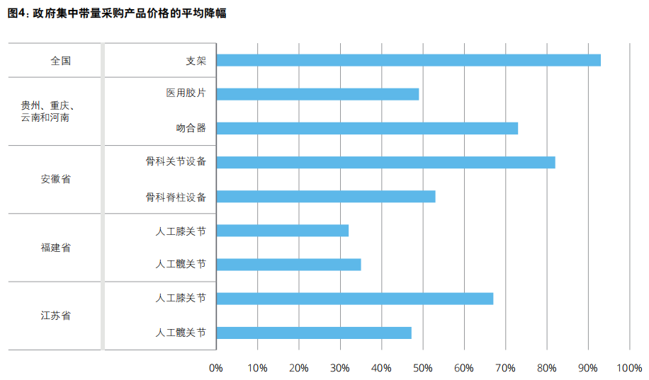 中國政府因此開始采用集中采購的方式,有針對性地降低特定器械產品的價格。2020年,中國引入了心臟支架集中采 購的招標制度,采購的支架足以滿足70%以上的醫院預估需求,共有八家企業(六家國內企業和兩家外國企業)中標。這一 制度使支架價格大幅下降,中國政府報告 稱,與前一年相比,平均降價超9成。第一批集采結束后,政府表示正在從各省采集第一批醫用耗材清單數據,以為下一輪全國耗材集采做好準備。第二批醫用耗材清單主要包括人工髖關節、人工膝關節、除顫器、封堵器、骨科材料、吻合器 六大類。