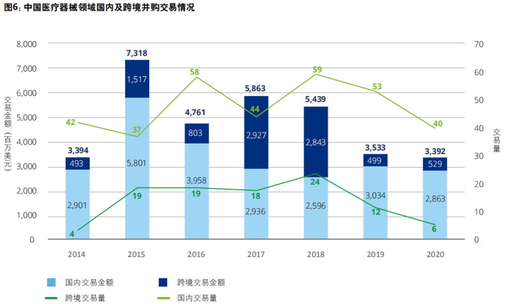 下圖6展示了中國醫療器械領域國內及跨境并購交易(含合資交易)的發展趨勢。可以看出,就交易規模而言,跨境并購交易的波動性相對較大,這是因為跨境并購 交易更可能出現超大型并購案。由于高端器械嚴重依賴進口,國內企業希望通過并 購交易獲得新技術或新產品。盡管全球 中國市場和所有市場一樣,具有其獨特 性。本土化意味著接受中國分部需要一定 程度的自主權。外國企業在中國取得成功 的案例中,一個共同的因素是賦權當地實 體根據當地實際情況進行有效決策。在中 經濟形勢嚴峻、跨境交易數量有所下降, 但醫療器械行業并購交易在2020年總體仍保持相對穩定,反映出疫情期間該行業的重要性。該行業年度最大交易案其中之一是迪瑞醫療,這是一家專門生產疾病檢測設備(包括核酸檢測)的中國醫療器 械企業。