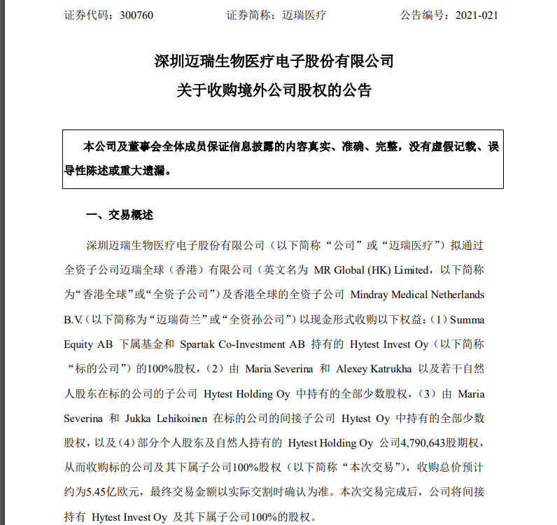 5月16日,邁瑞醫療發布公告稱:公司擬通過全資子公司邁瑞全球(香港)有限公司及香港全球的全資子公司Mindray Medical Netherlands B.V. 以現金形式收購Hytest Invest Oy(下文簡稱“海肽生物”)及其下屬子公司100%股權。