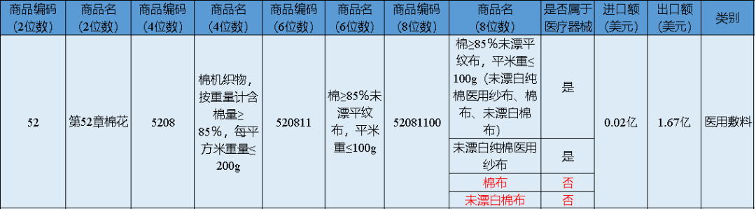 部分8位海關編碼商品包含醫療器械與非醫療器械商品,統計的醫療器械進出口貿易數據比實際偏高。以編碼52081100為例,包含醫用與非醫用兩類棉機織物,出口額合計1.67億美元。