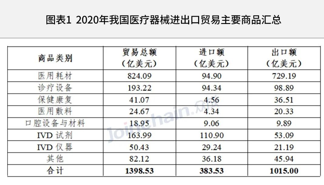 2020年我國醫療器械對外貿易額達到1398.53億美元,同比增長112.0%。其中進口額383.83億美元,同比增長5.2%;出口額1015億美元,同比增長244.0%。