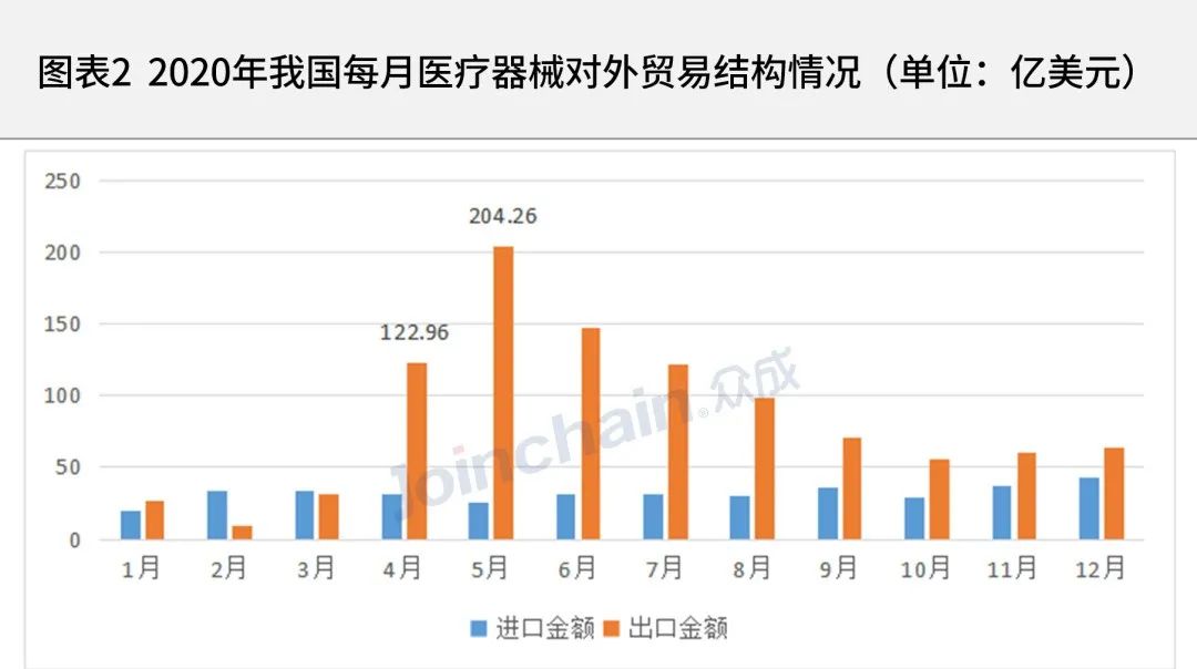 從2020年1-12月醫療器械進出口貿易數據看,5月醫療器械出口額達到峰值,為204.26億美元。2020年1-12月醫療器械進口額波動不明顯。
