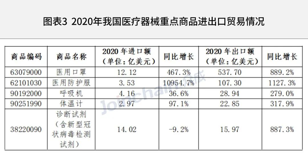 醫用口罩、醫用防護服、呼吸機、紅外體溫計和診斷試劑貿易額亮眼。