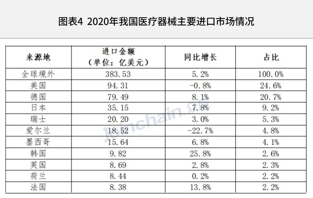 2020年我國醫療器械進口前三的國家/地區:美國、德國、日本;2020年我國醫療器械出口前三的國家/地區:美國、英國、德國。
