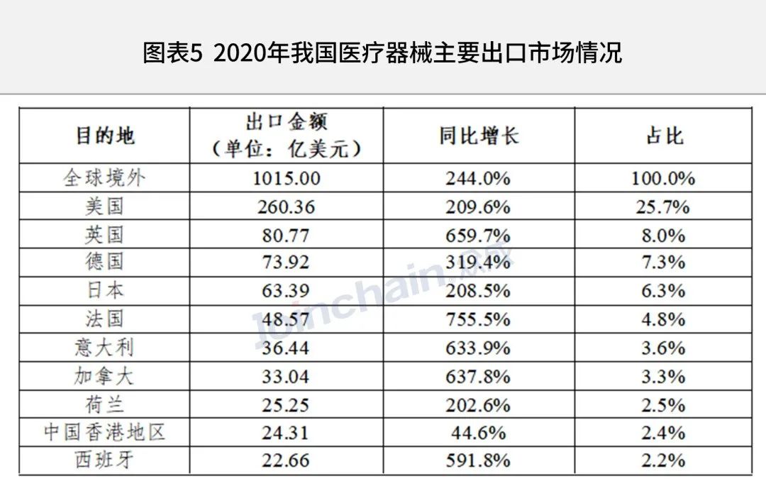 在出口市場方面,2020年我國醫療器械出口1015.0億美元,同比增長244.0%。出口地主要為美國、英國、德國、日本和法國等。其中,出口美國的醫療器械商品達260.36億美元,含148.04億美元的口罩與防護服產品。另外,出口法國、英國、加拿大的增幅顯著,分別為755.5%、659.7%和637.8%。