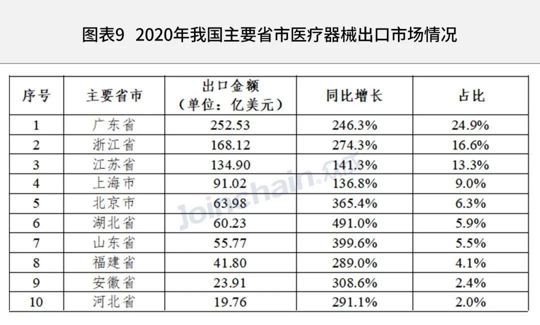從全國出口海關口岸的貿易數據來看,廣東省是我國醫療器械出口額最高的省份,2020年出口額達到252.53億美元,全國占比24.9%;其次為浙江省168.12億美元、江蘇省134.90億美元。另外,湖北、山東、北京增幅排在前三位,分別為491.0%、399.6%和365.4%。