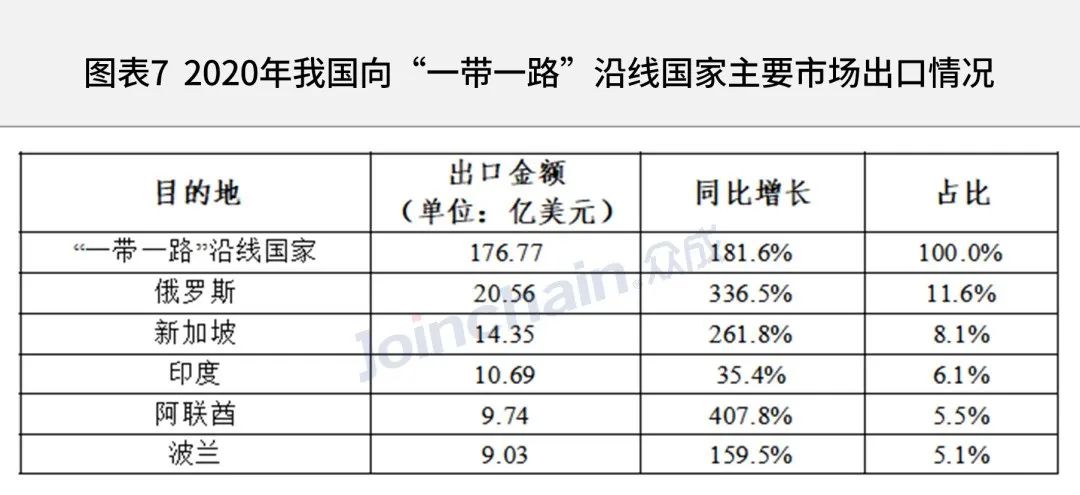 2020年我國向“一帶一路”沿線國家出口醫療器械商品總額達176.77億美元,同比增長181.6%。主要出口國家為俄羅斯、新加坡、印度、阿聯酋和波蘭等地。