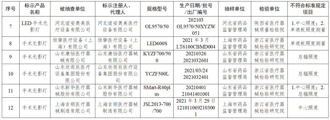 (五)手術無影燈7臺:分別為常州美亞醫用照明有限公司、河北誼安奧美醫療設備有限公司、恒摯醫療設備(上海)有限公司、山東康怡醫療器械有限公司、山東欣雨辰醫療設備集團股份有限公司、山東新華醫療器械股份有限公司、上海吉順醫療器械制造有限公司生產,涉及保護接地阻抗、中心照度、單遮板照度測量、總輻照度不符合標準規定。