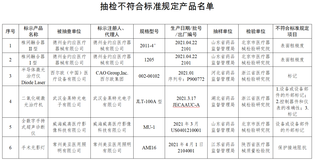 通知顯示,為加強醫療器械監督管理,保障醫療器械產品質量安全有效,國家藥品監督管理局組織對椎間融合器、半導體激光治療機等5個品種進行了產品質量監督抽檢,共12批(臺)產品不符合標準規定。