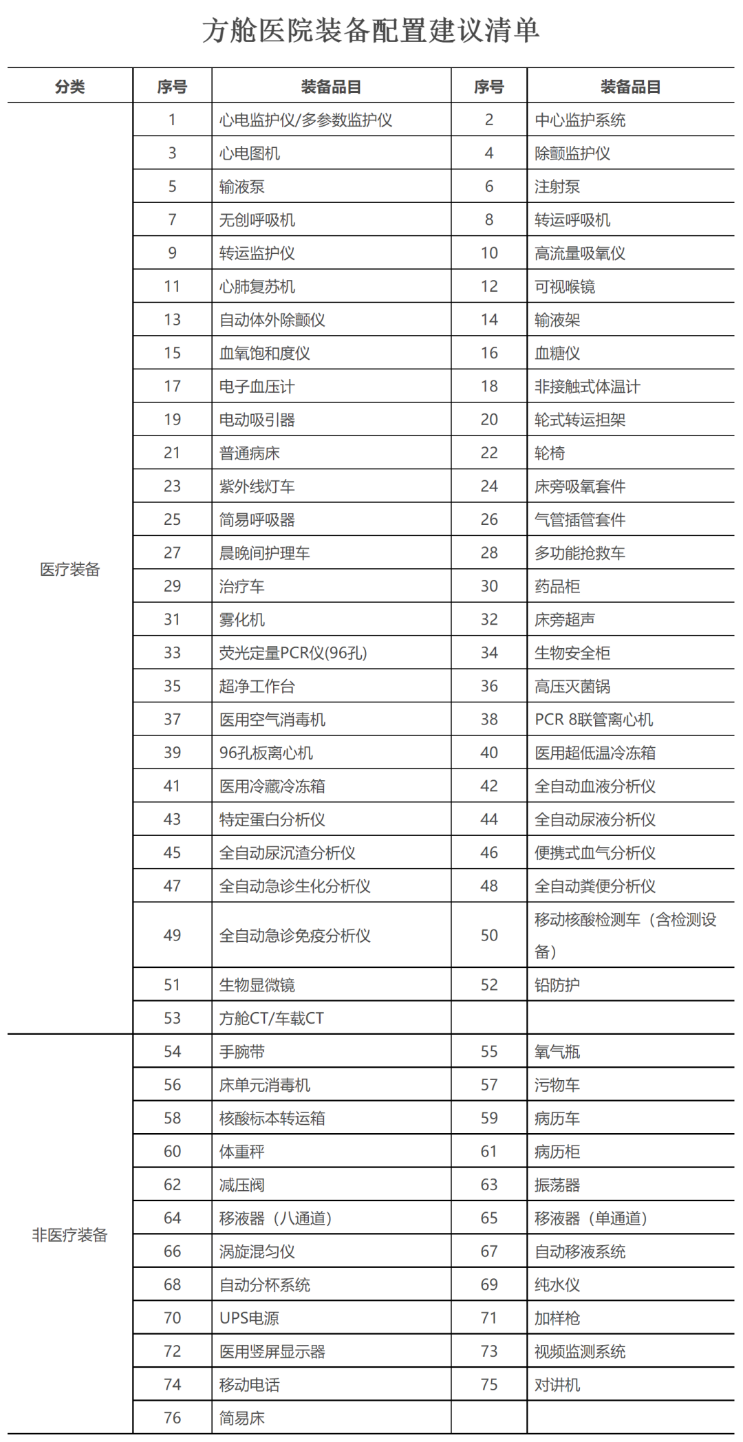 7月13日,國家衛生健康委辦公廳發布《關于印發方艙醫院裝備配置指南(試行)的通知》,明確方艙醫院裝備配置建議清單(附文末)。