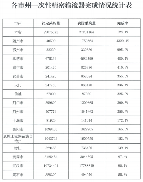 截至2022年6月,一次性精密輸液器類耗材執行20個月,完成率為128.1%,絕大多數市(州)落地執行較好,其中隨州市完成率高達4320.4%。