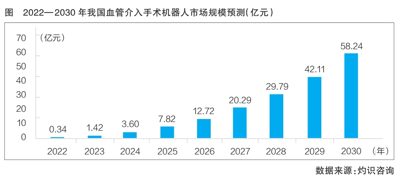 我國血管介入手術機器人行業雖起步較晚,但其市場規模增長潛力巨大。灼識咨詢數據顯示,預計今年我國血管介入手術機器人市場將達到0.34億元,并將于2030年達到58.24億元;2022—2030年復合年增長率為90.3%,超過全球血管介入手術機器人市場規模增速(詳見圖)。