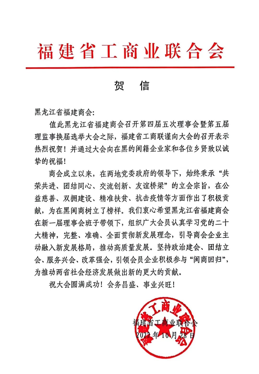 福建省工商聯向龍江閩籍企業家致以祝福,希望商會在新一屆班子的帶領下,組織會員認真學習二十大精神,引領會員積極參與“閩商回歸”,為推動兩省經濟社會發展做出新的貢獻。