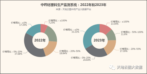 其中,2023年價格同比≥100%和價格同比≤0%的品種較2022年有明顯的增長,分別增長了5.80%和15.94%;2023年價同比格50%-100%、價格同比20%-50%和價格同比0%-20%的品種較2022年有明顯的下滑,分別下滑了7.25%、1.45%、13.04%。