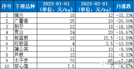 表2:2023年2月防疫類中藥材原料月度下跌TOP10品種